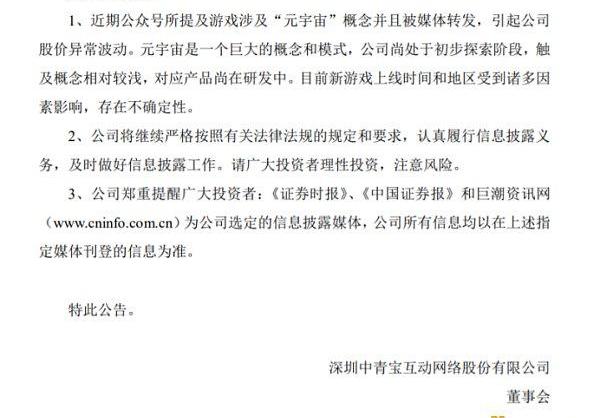 同樣漲幅居前的中青寶也發布了股價異常波動公告。公告指出,近期公眾號所提及游戲涉及“元宇宙”概念并且被媒體轉發,引起公司股價異常波動。元宇宙是一個巨大的概念和模式,公司尚處于初步探索階段,觸及概念相對較淺,對應產品尚在研發中。目前新游戲上線時間和地區受到諸多因素影響,存在不確定性。