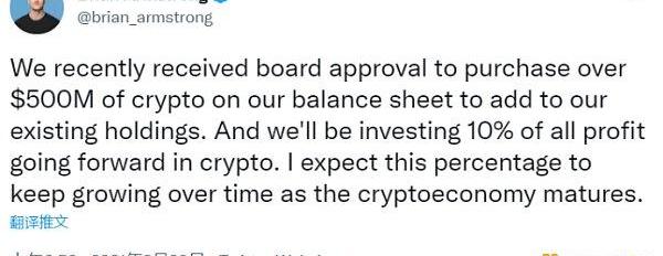 XRP/HKD-1.06%8月20日消息,Coinbase聯合創始人兼首席執行官BrianArmstrong發推稱,我們最近獲得了董事會的批準,在我們的資產負債表上購買超過5億美元的加密貨幣,以增加我們現有的持有量。而且我們將把所有利潤的10%投資于加密貨幣。隨著加密經濟的成熟,我預計這個比例會隨著時間的推移而不斷增長。
