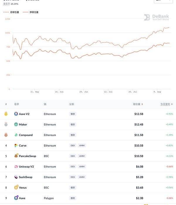 DeFi項目鎖定資產前十排名及鎖倉量,數據來源:Debank