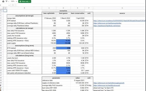 在這張電子表格中,他完成了一些關于ETH在合并后的以太坊網絡上的供應回報和銷毀率的粗略計算。這很有啟發性。