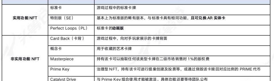 非實用功能卡包括卡背、概念卡和資產卡,其中概念卡和資產卡的二維碼顏色統一為白色。卡背雖然是游戲卡,但是在游戲中并無實用功能,忠實玩家可能會想要選擇自己的Parallel卡背,或者特殊動畫的卡背;概念卡則是作為收藏的藝術品,其價值可能由卡牌制作精美程度或者發行版次決定;資產卡則是較為特殊的一類NFT,其中PrimeKey則是治理型NFT,持有該卡可參與創建提案及投票,或者燃燒PrimeKey,贖回對應比例的PRIME代幣,燃燒過后的PrimeKey將變成一張沒有任何功能的紅色收藏卡,該項目未來的代幣經濟模型可能將由該卡決定,獲取途徑為空投、二級市場購買或者補充包購買;CatalystDrive需要與PrimeKey結合使用,總量150張,其玩法還要等待官方后續公布,獲取途徑為二級市場購買或補充包購買。