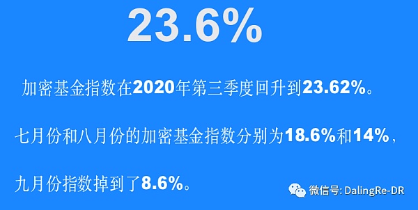 加密基金指數在2020年第三季度回升到23.62%, 七月份和八月份的加密基金指數分別為18.6%和14%,九月份指數掉到了8.6%