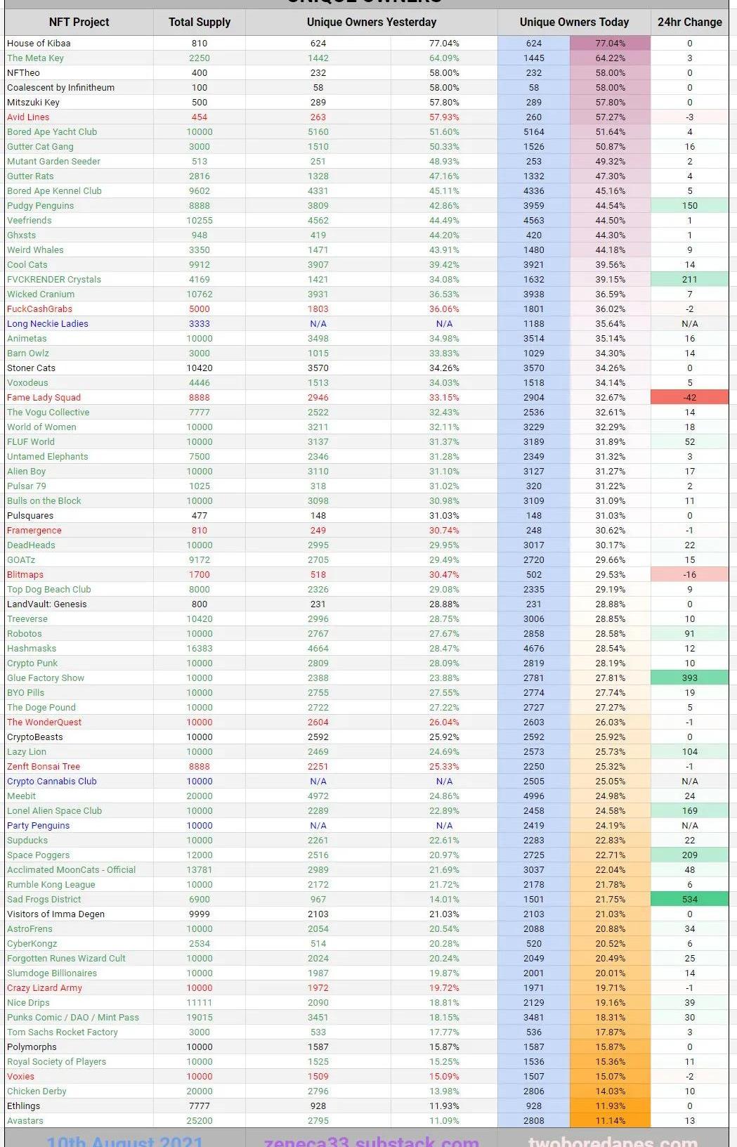 圖示為@Zeneca_33的每日更新內容。圖表內數據包含NFT項目的名稱、總供應量、鑄造價格、昨日/今日底價、24小時內價格變更、在售數量。