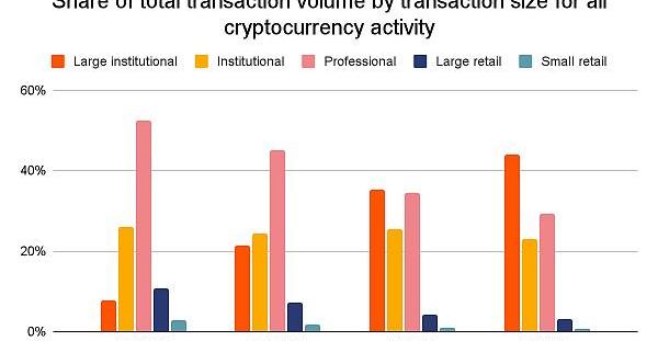 與所有加密貨幣活動相比,DeFi協議按交易規模大小劃分的交易量份額加強了我們對誰在使用DeFi的理解。