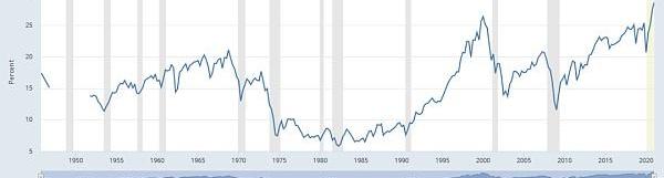 家庭和非營利組織,直接或間接持有的公司股票占總資產的百分比?來源:FRED