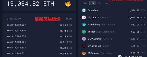 目前手續費消耗大戶,可以看到主要有幾個領域,一個是NFT,Opensea這幾天的手續費銷毀了1500多eth,排在第一,游戲Axie的交易量也依舊火爆,另一個是DEX-Uniswap,然后就是穩定幣。