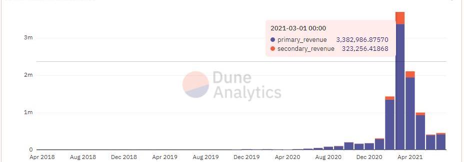 Opensea是全球最大的綜合性NFT交易平臺,涉及的NFT包括藝術、音樂、域名、體育等。同時,Opensea還提供有免gas手續費鑄造、出售NFT的服務,這一點在市場鶴立雞群。根據DuneAnalytics上的數據,2021年2月之前,Opensea上的NFT交易一直不溫不火。來到二月份,NFT市場整體交易量呈現爆炸式增長,Opensea也不例外。整個二月份,Opensea的總交易額相比一月增長了十倍以上,達到了9500萬美元以上,總交易NFT數增長了四倍,達到4萬余件,活躍用戶增長了一倍,為15000余人。隨后,伴隨著NFT市場的火爆,Opensea的熱度也始終保持在較高水平,于5月4日達到了單日交易額2300萬美元的最高紀錄。