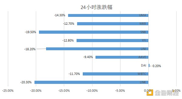 市值前十幣種漲跌幅,金色財經制圖,數據來源Debank