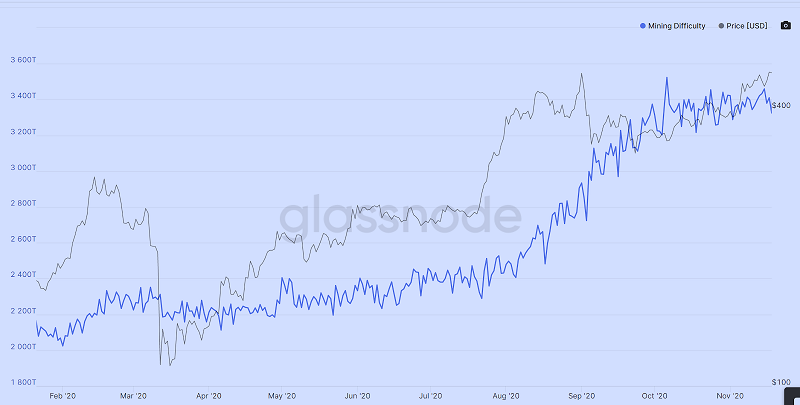 根據Glassnode的數據,以太坊的挖礦難度在2018年8月9日達到3651TH的歷史最高水平。