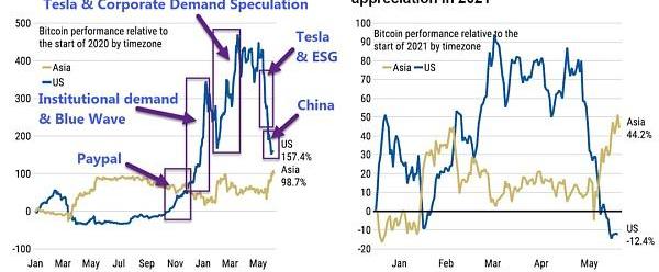 另外,越來越多的機構開始采用比特幣,這可能意味著宏觀經濟學在最近的拋售中發揮了作用。2021年5月12日,美國的消費者價格指數(CPI)顯示較上年同期上漲4.2%,這是自2008年9月以來最高的水平。鑒于市場過熱的跡象,盡管糟糕的美國就業數據緩解了這種跡象,美聯儲的會議紀要暗示,他們開始考慮縮減購債規模。這導致了美元實際收益率上升+9個基點,盡管傳統金融市場保持相對平靜。市場已經知道,由于COVID-19的基數效應(baseeffect)較低,通脹數字很高。