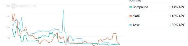 此外,隨著投資者借貸需求的減少,所有借貸平臺的供應收益率都大幅下降。在三個月的時間里,穩定幣的借貸利率,尤其是USDC,從平均9.6%下降到1.4%,下降了近85%。