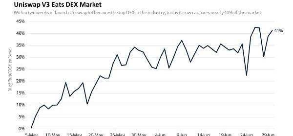 UniswapV3目前占DEX總成交量的40%以上,并繼續蠶食DEX市場,沒有顯示出放緩的跡象。