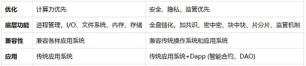 前面講的密中密、塊中塊、層分層、片分片等技術是我們提出來的新系統設計原則,這些原則可以鏈化操作系統。傳統操作系統以計算機為優先,新型的以安全隱私監管為優先。傳統的底層功能是進程管理、I/O、文件處理、內存、存儲;現在這些都全盤鏈化,密中密、塊中塊、片分片、監管機制,都可以和傳統機制一同進行,這樣整個架構不一樣了。