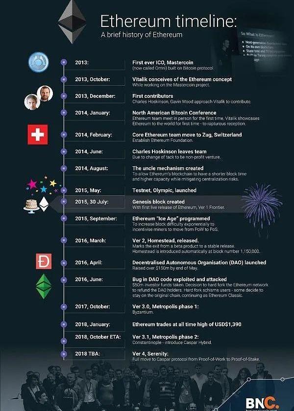 以太坊發展的時間線,引用自BraveNewCoin。倒數第二個里程碑已經過時——推遲到了2019年1月?