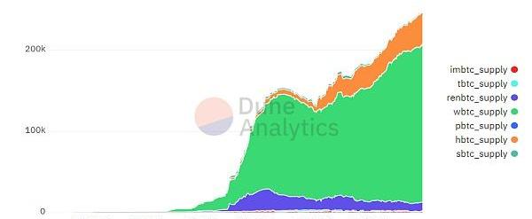 根據DuneAnalytics的數據統計,2021年上半年,DeFi中的BTC鎖倉量大約從133,105增長到249,714,鎖倉BTC增長116,609,增長率約為88%。