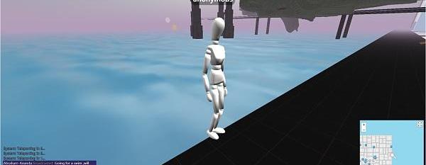 這個懸在半空的舞廳是Vibe的最高建筑,礙于電腦的運行速度,我并不能看到這座富饒之島的全貌,只能看到一片紫霧。我突發奇想,從平臺一躍而下的時候,說不定就能看到一個城市在我眼前隨著貼圖加載慢慢生成的景象。現實是,垂直方向的卡頓讓我幾乎懸浮在空中。我在空中漫無目的亂走,一直越過了土地的邊界后才落地。準確地說是墜海,小人也配合做出溺水掙扎的動作。