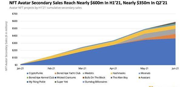 也許,上一個季度最重要的趨勢之一是NFT頭像項目的繼續。NFT頭像,專門為個人在互聯網上代表自己而設計的收藏品,繼續呈現流行趨勢。這個新興行業在整個21年第二季度產生了近3.5億美元的二級銷售,而整個2021年上半年產生了近6億美元。
