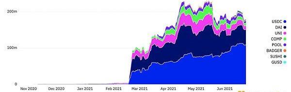 PoolTogether集成Dharma智能錢包后,POOL代幣在2月份進行空投,最近PoolTogether3.0也上線了,繼續吸引更多用戶和存款,提高獎金金額。該協議的存款從3月初不到1億美元增加到2億美元,圖表上2月到3月大增長背后的原因是代幣空投和流動性挖礦項目。