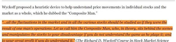為了幫助人們發現這種市場操縱行為,威科夫提出,應該把市場和各種股票的所有波動作為一個人操作的結果來研究。讓我們稱他為綜合人,在理論上,他坐在幕后操縱股票,使你處在不利地位,如果你不了解他所玩的游戲的話。而如果你了解它,就會為你帶來巨大的利益。