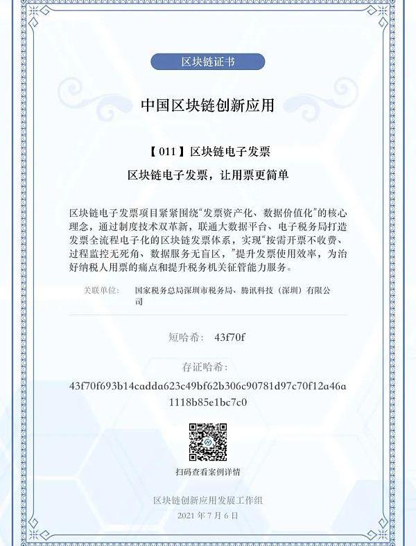 本項目榮獲工信部2018年可信區塊鏈峰會十大應用案例第一名、中國電子信息博覽會CITE2019區塊鏈應用創新優秀案例、并于2020榮獲“深圳市市長質量獎”等多項權威大獎,入選部區塊鏈服務信息網絡安全試點項目并順利通過驗收,獲得中國科學院、中國社會科學院、財政部、部、中央網信辦、工信部和央行等有關專家組高度評價和認可,獲得國際貨幣基金組織專家、“一帶一路”沿線國家稅務部門代表盛贊,并受邀參加中韓稅收政策交流會分享區塊鏈電子發票系統建設經驗。