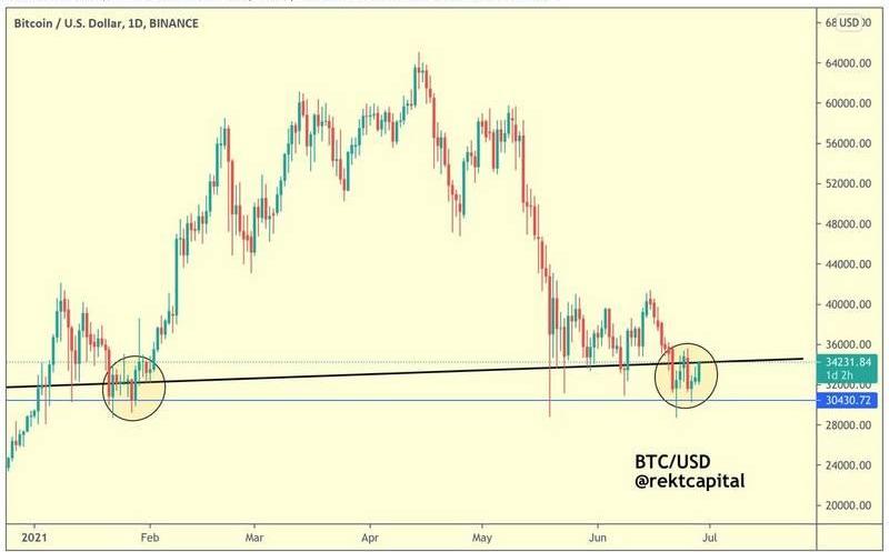 周日臨近收盤時,比特幣一改頹勢,迅速反彈,在幾個小內內上漲了2000多美元。其Bitstamp上最高觸及35250美元高點,周收盤價超過了34000美元。站上關鍵點位,無疑給了多頭注入一針強心劑。