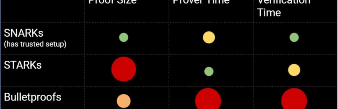 這?零知識證明主要是?于以太坊區塊鏈上發布并公開記錄該區塊的有效性。在Layer2上被打包的交易將會以?個證明的形式發布于主鏈,這使得每個?都有驗證它的辦法。主要?的是防?有?惡意利?Layer2上的交易來篡改信息。值得注意的是,零知識證明并不是隱私保證,也不是加密系統。因為除了擁有該秘密的?以外,沒有?可以解密。從誕??今,零知識證明或者說ZK-Rollup經歷了三個發展階段:SNARK,STARK,和Bulletproofs.?前來說Zcash,ZKSync(MatterLabs),DarkForest(Game)等在使?SNARK,Monero使?Bulletproofs.從下圖中可以對?這三種?法的區別。具體例?將在后?介紹。