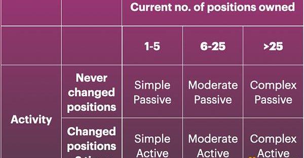 “簡單被動”是指一個地址只擁有一個UniswapV3頭寸,并且沒有對其進行過任何改動。從各種意義上說,它代表著一個“懶惰”的流動性提供者。“復雜主動”則是指流動性提供者擁有多個頭寸并積極管理。如果活動次數大于持有的頭寸數量,則可以推斷出這一點,以2作為評判是否活躍的閾值。