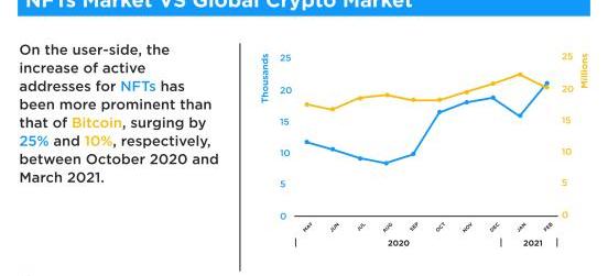 2.?2020年Q4至2021年Q1時間段內,NFT獲得了比比特幣更高的人氣,截至今年2月份,NFT市場內活躍地址達到2萬個。在用戶方面,NFT的活躍地址比比特幣更具有優勢,在2020年10月至2021年3月期間分別增長了25%和10%。