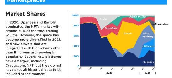 隨著新玩家的進入,OpenSea和Rarible在交易量上的主導地位已經從2020年的70%下降到不到50%。Opensea和Rarible在2020年占據了NFT市場70%左右的交易量。然而,NFT在2021年變得更加多樣化,與以太坊以外的區塊鏈集成的新玩家越來越受歡迎。當前,包括加密元素,Crypto.com等幾個新NFT平臺已經出現,但他們目前沒有足夠的歷史數據被包括在內。