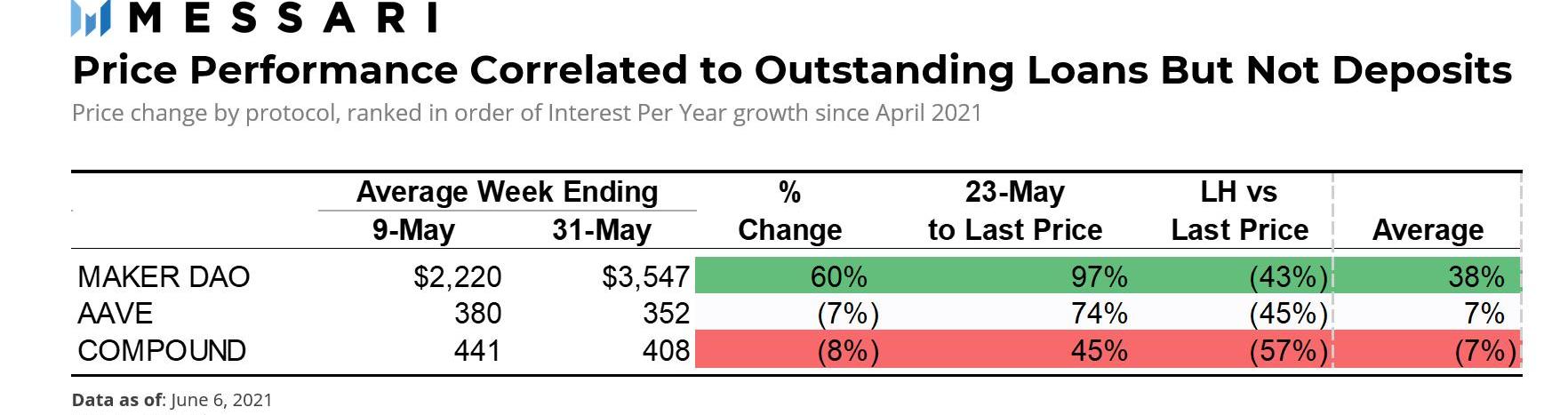 價格表現表明,未償還貸款是價格恢復的一個重要指標,但貸款中的存款是一個不相關的指標。在5月份的拋售中,Maker表現出色,而Compound則表現不佳。盡管Aave的貸款中的存款減少得最少,但價格表現卻只是平均水平。這表明,與TVL類似,市場認為貸款中的存款這一點不是很重要。