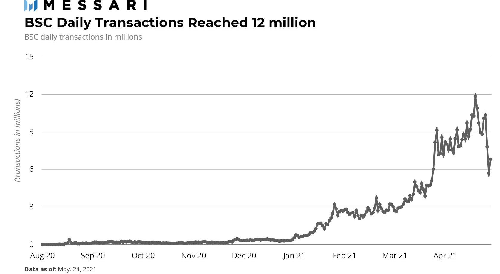 BSC最大的價值主張之一是其廉價的gas費用模式和快速執行。例如,5月18日,以太坊上交換代幣的平均成本是~40美元,而在BSC上是~0.2美元。高昂的gas費用對許多零售用戶來說過于昂貴,因此,在過去的幾個月里,BSC網絡在幾乎所有的關鍵指標上都享有拋物線式的上漲。據下表顯示,BSC網絡的日活躍地址,即衡量作為發送方或接收方在網絡上活躍的唯一地址,在2021年5月從不到100個增加到了超過100萬個,甚至已經超過了以太坊網絡的地址。