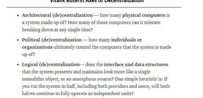 與流行的觀點相反,可以跨多個軸定義中心化。VitalikButerin通過架構、和邏輯軸線來衡量(去)中心化。
