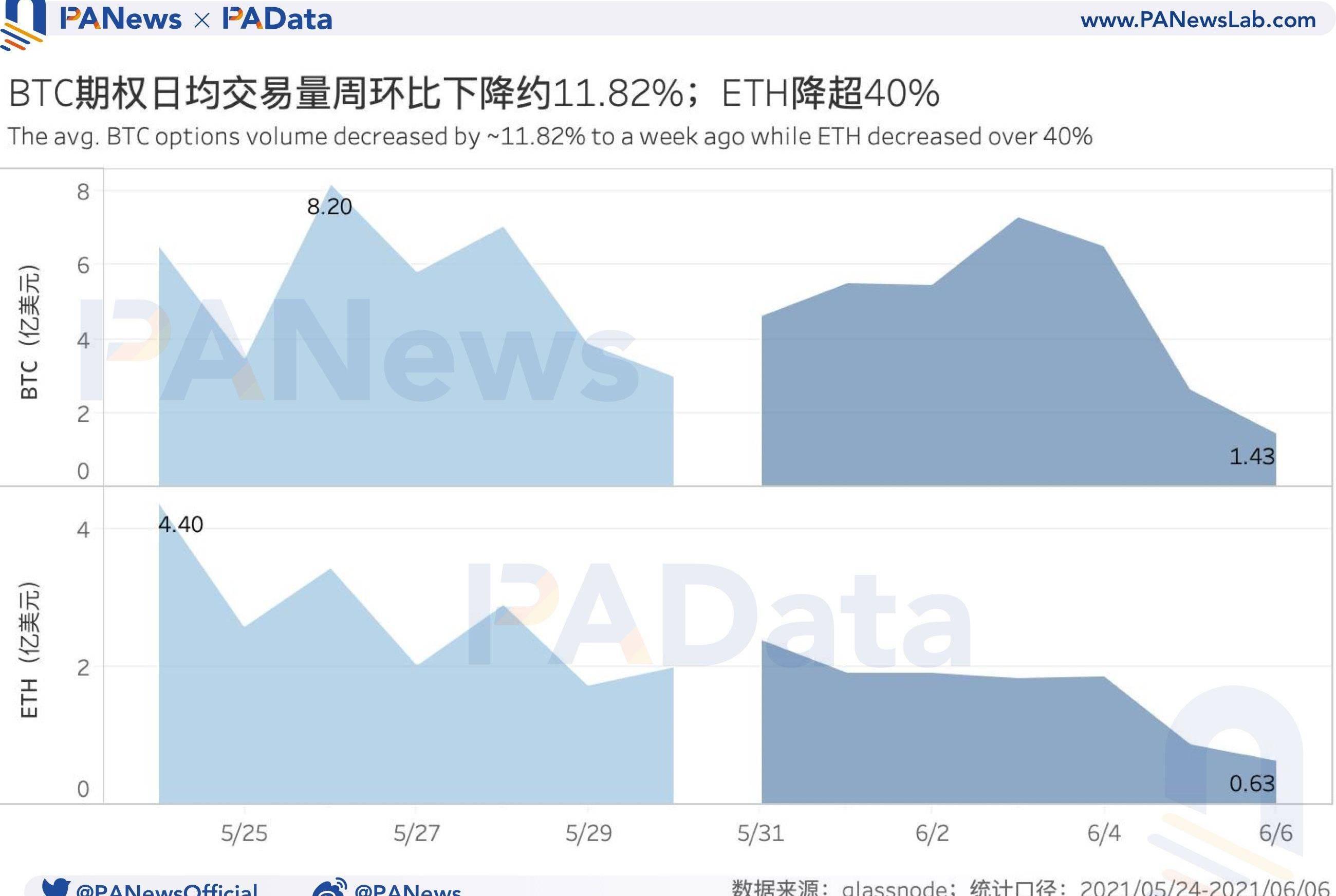 上周,BTC和ETH日均期權交易量分別約為4.79億美元和1.64億美元,周環比分別下跌約11.82%和40.06%。ETH的期權交易量已連續三周下跌,且三周跌幅均超28%。6月6日,BTC和ETH的期權交易量分別約為1.43億美元和0.63億美元,為近一個月來最低。