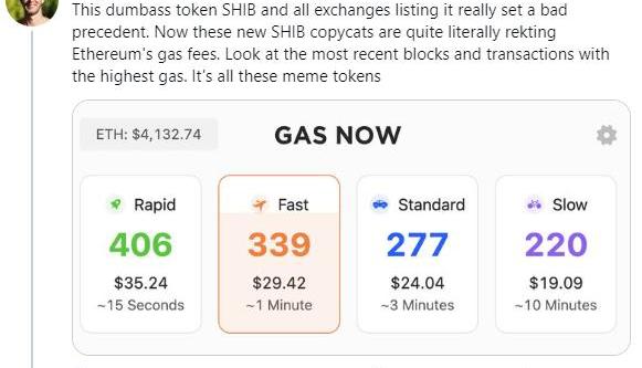 以下是實際發生的事情:幾周前,以太坊網絡的使用成本飆升,因為有人模仿狗狗幣(Dogecoin)創造出了一種幣Shiba,它短暫地流行了一段時間,以至于其他所有東西都變慢了或更貴了。因為以太坊的交易容量是有限的,任何使用該網絡的人要么必須在隊伍后面排隊,要么支付更多的費用才能排在這些Shiba交易者的前面。