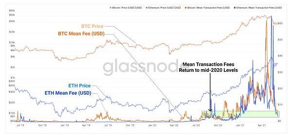 隨著對鏈上交易的需求下降,兩大網絡支付的平均交易費用也都減少了。在4-5月份的時候,兩大網絡的平均交易費用達到了歷史最高水平,短期峰值均超過了60美元。而目前,這兩個網絡的平均交易費用已恢復至2020年中期的水平,約為3.5-4.5美元。