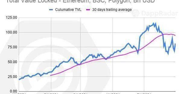 2021年5月對區塊鏈行業來說是一個繁忙的月份,因為有超過100萬個唯一的活躍錢包與區塊鏈連接。本月推出了480多個新的DApp,而DeFi領域在以太坊、BSC和Polygon這3個主要協議上鎖定了超過810億美元的價值。