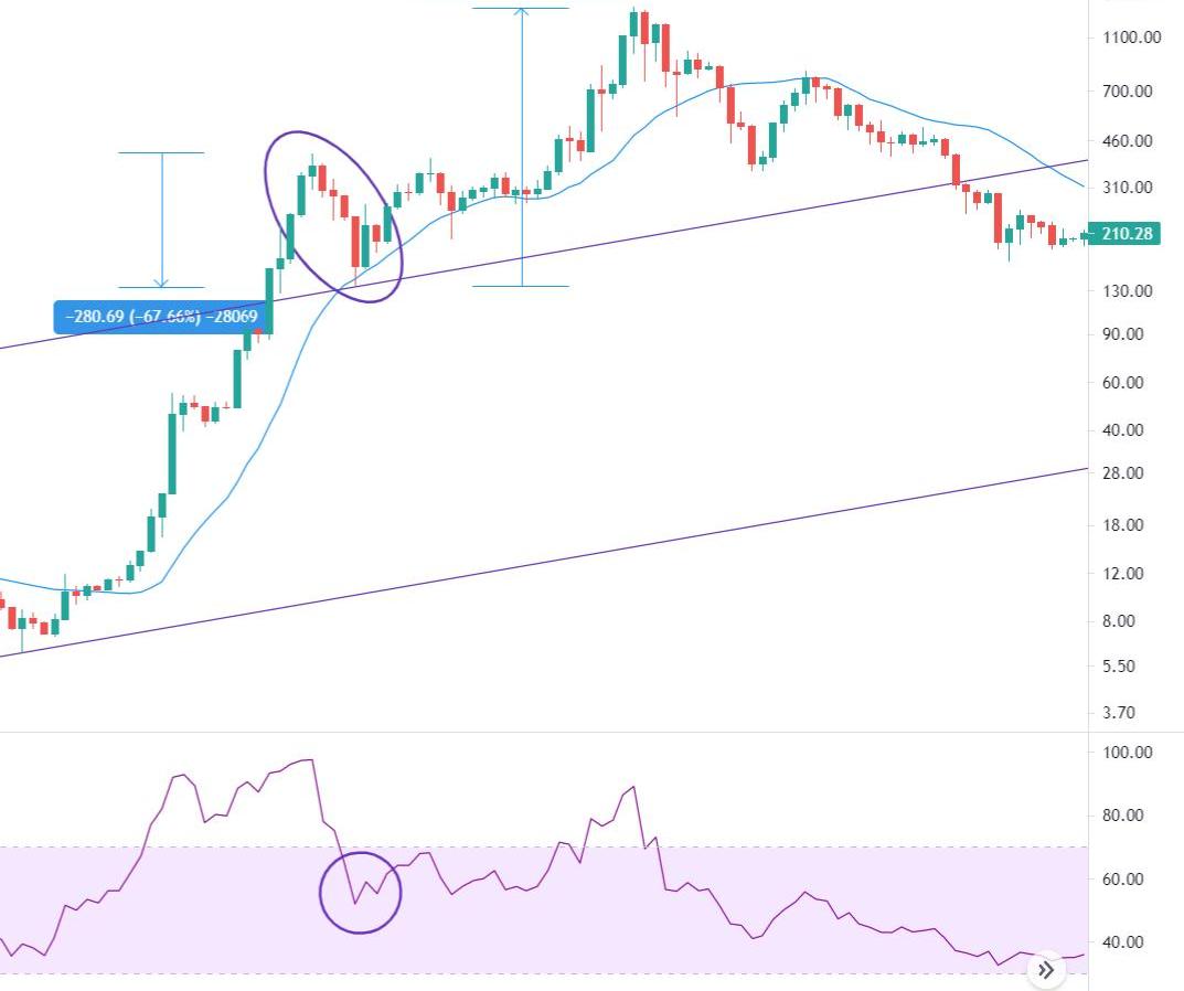 同樣也回測趨勢線支撐,這一帶也有周線20均線支撐,兩者自牛市啟動以來一路拉升,期間并未回踩,都是在這一波大調整中回撤到該均線附近,同時大幅調整帶動RSI數值都跌至52支撐附近,17年牛市ETH在這一帶整理蓄勢后繼續上攻,后面再迎來將近10倍漲幅,目前走勢和之前非常相似,趨勢線以及均線附近止跌反彈。