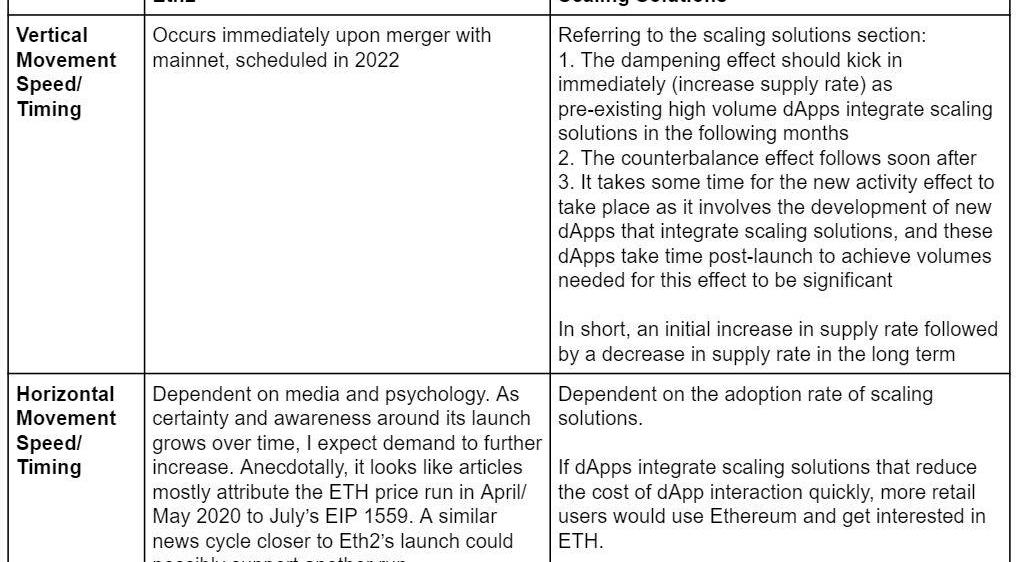 以太坊基礎結構變化對ETH供求影響的圖表。箭頭表示隨時間的預期變化,框的大小表示不確定性