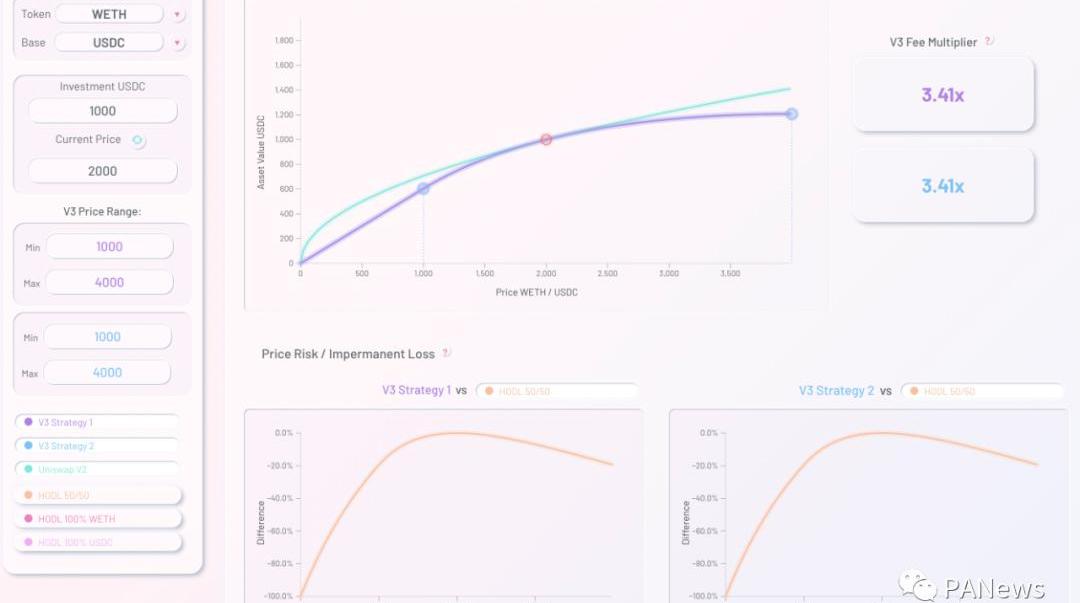 交易手續費對于普通用戶的吸引力將繼續降低,風險/收益比上升。若沒有足夠優秀的策略,當前在Uniswap的小區間內提供流動性的風險極大。雖然Uniswap能成倍地提升資金使用效率,但無常損失也在成倍增加。根據htdefi-lab.xyz/模擬器計算,若將流動性聚集在市場價格的一半至二倍處,資金利用率是原來的3.41倍,那么在市場波動時,無常損失也會成比例地增加。根據實際體驗,當前0.3%手續費一檔的ETH/USDT交易對的平均流動性遠比這還要集中。在當前市場價格波動過較大的情況下,將流動性聚合后,無常損失可能不足以彌補手續費收益。