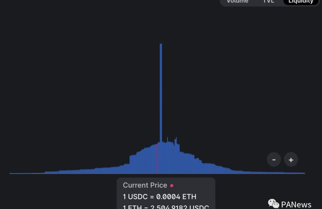 流動性將繼續向市場價格附近聚集,并隨著市場價格變化而變化。以當前流動性最好的ETH/USDC交易對為例,ETH價格為2505USDC,流動性大多分布在2000~3400美元的范圍內。從下圖中也可以看到,在2560~2600美元范圍內,有大單在此提供流動性,當價格漲破此區間,則該用戶的ETH全部賣出,提供流動性與排單交易之間也不再不可分割。