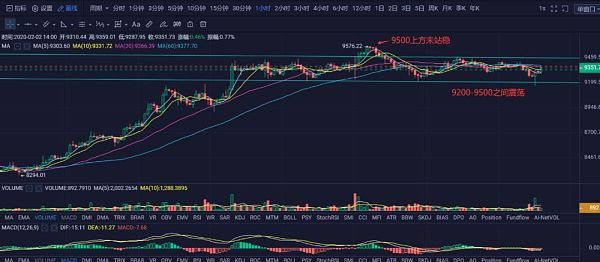 小時線上看自29號開始,行情便進入了上漲后的整理消化階段,主要運行區間在9200-9500之間,期間一度上破9500但未站穩。目前節奏也很明確,靠近9200便介入短線多單,突破9500時便等回踩后再介入多單。雖然有上漲接近9500時的空單機會,但即使是短線,逆勢做單風險也是極大,一般不建議操作,如操作了也需要有明確的止盈和止損位置,一定要秉持著落袋為安的交易理念。