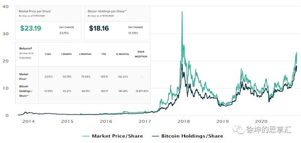 美股OTC市場與比特幣現貨市場是兩個隔離的市場,不可贖回、6個月鎖定期、有限的流通量,都給套利設置了一定的門檻,也使信托份額在二級市場長期有正溢價。而且流通率越低,溢價越高,比如萊特幣信托(LTCN)二級市場溢價一度高達57倍,但實際流通量不到10萬份,流通率只有1%。而比特幣信托的溢價隨著二級市場的活躍有收窄的趨勢,目前約為20%左右。