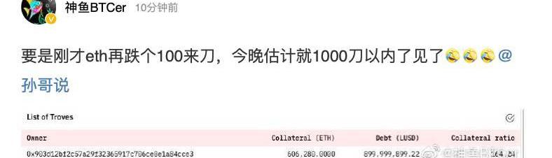 根據神魚的爆料,如果ETH再跌100多美元,孫宇晨的60多萬個ETH就將清算爆倉,屆時將把ETH價格進一步打壓至1000美元以下。?