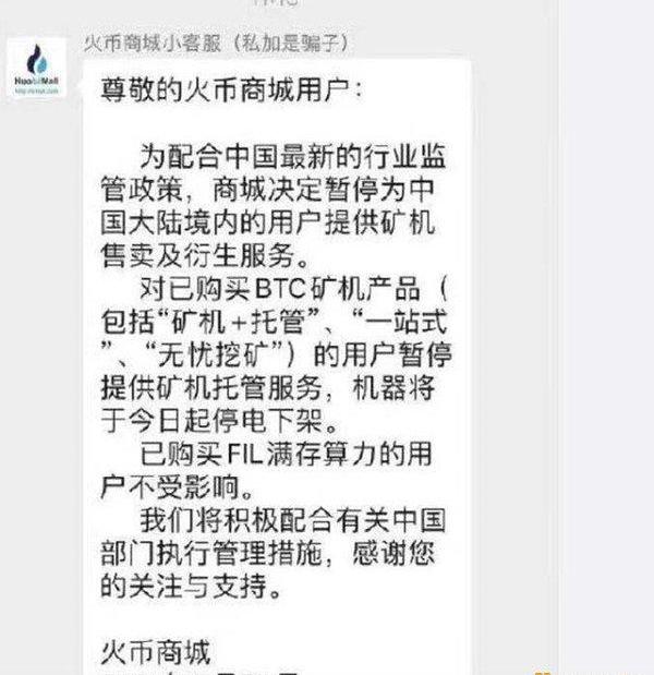 值得一提的是,5月13日,一則火幣商城客服微信社群公告在網上流傳。公告稱,“為配合中國最新的行業監管政策,商城決定暫停為中國大陸境內的用戶提供礦機售賣及衍生服務。對已購買BTC礦機產品的用戶暫停提供礦機托管服務,機器將于今日起停電下架。已購買FIL滿存算力的用戶不受影響。”