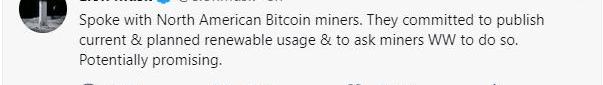 XRP/HKD-2.26%25日,馬斯克發推表示,他與北美比特幣礦工交談,礦工承諾發布當前和計劃中的可再生能源使情況,并鼓勵行業跟進實施。他暗示,這是比特幣潛在的希望。