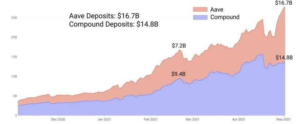 Aave和Compound是DeFi最大的借貸協議。直到最近,就存款總額而言,Compound一直是最大的借貸協議。而Aave通過其新的流動性激勵措施扭轉了這一局面,目前其在借貸中占據了流動性的主導地位。