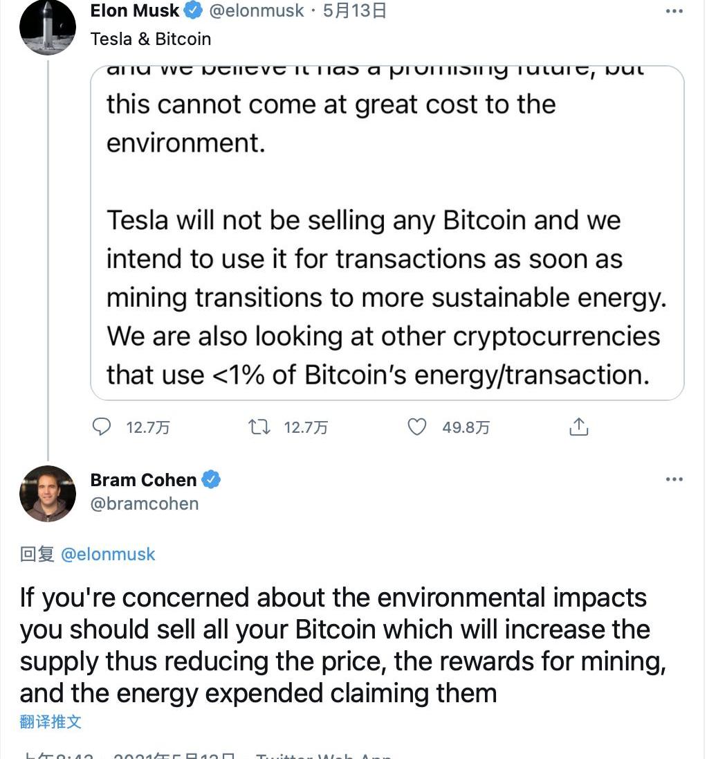 Chia創始人Bram則更加直接地進行了反駁。針對埃隆·馬斯克稱特斯拉暫停使用比特幣一事在推特評論稱: