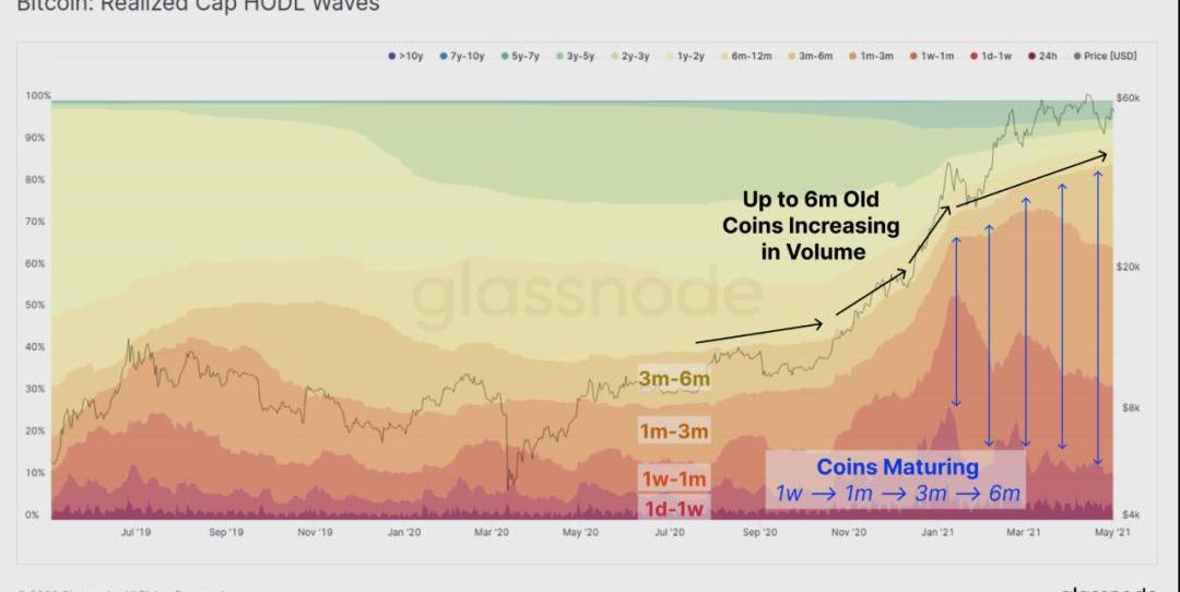 比特幣成熟的現象已經在前幾周進行了討論,我們注意到,超過155天的比特幣被重新分類為長期持有人比特幣。注意:155天前是2020年11月上旬,價格從$16k上漲至$18k盤整,然后打破了上一個周期的歷史新高。