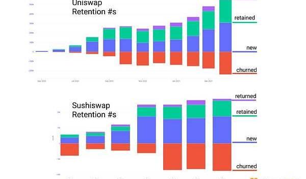 在以下細分中,我們看到Uniswap在4月份流失了240,000個地址,同時留住,回歸并新建了615,000個用戶。我們看到Sushiswap流失了18,000個地址,同時留住,回歸和創建31,000個用戶。這使Uniswap的凈用戶留住量為+375,000用戶,而Sushiswap的凈留住量為+13,000用戶。
