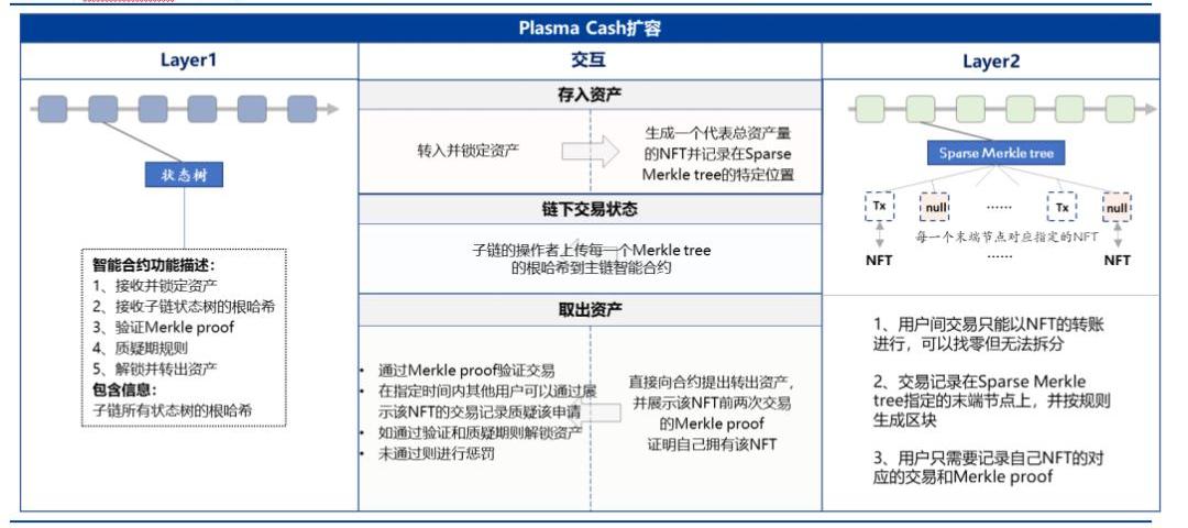 Plasma可以看作是一種保障資產安全的側鏈技術,它將鏈下的狀態證明上傳主鏈,即使鏈下出現了安全問題,用戶也能夠證明并提出資產。Plasma技術架構目前主要有兩種主流的機制PlasmaMVP、PlasmaCash。